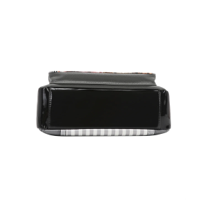 • Exterior de cuero vegano con detalles en charol brillante