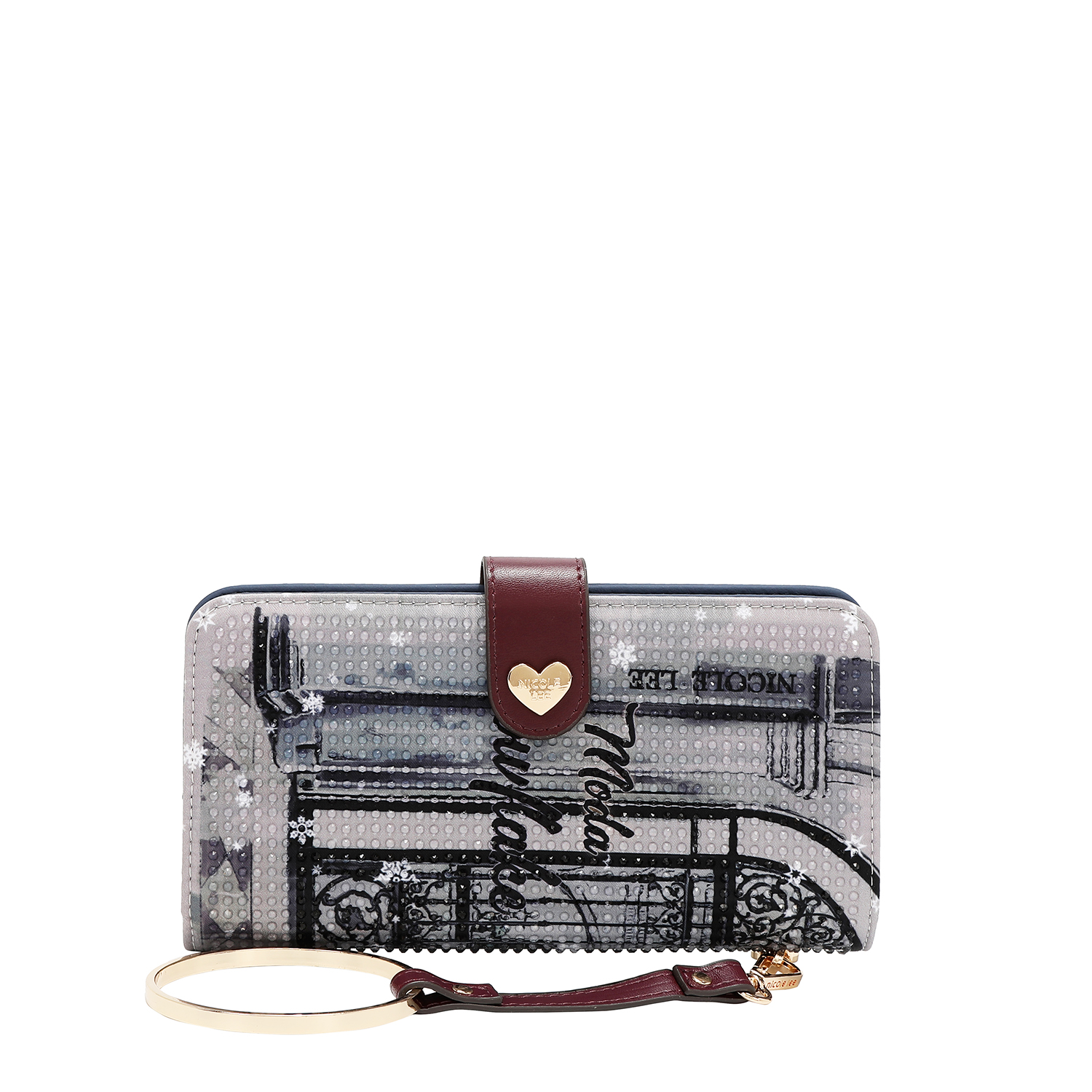 Conoce nuestra billetera clásica tipo bifold, diseñada con el estampado distintivo de Nicole Lee y una elegante correa de muñeca opcional.