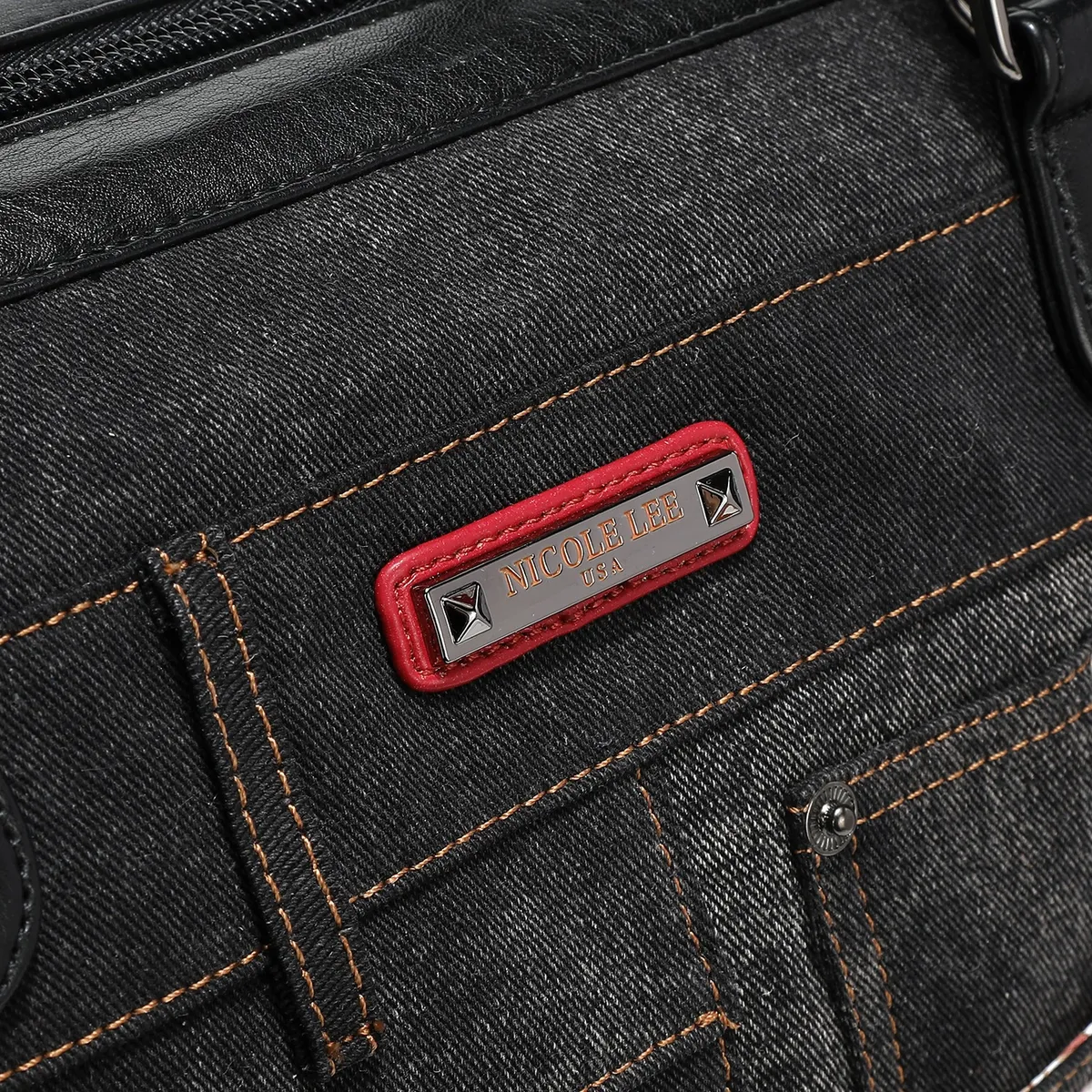 Fabricado en cuero vegano y denim. Cerramiento principal superior con cierre bidireccional extendido Asas superiores dobles enrolladas y estructuradas 2 compartimentos Diseño frontal adornado con diamantes de imitación y estampado exclusivo. Diseño de bolsillo estilo jean Bolsillos delanteros con cierres Bolsillo trasero con cierre y bolsillo deslizante con cierre en la parte inferior para usar como funda de equipaje Anillos en D para fijación opcional de correa de hombro y diversas opciones de transporte Compartimento con cierre envolvente de dos vías en la base para almacenamiento adicional Patas de metal en la base para mayor protección. Herrajes en tono metalizado Placa de identificación y tiradores de cierre con logotipo NL Forro interior premium estampado Amplia apertura interior Bolsillo interior trasero con cierre, placa con el logotipo y correa para llavero 2 bolsillos interiores traseros deslizantes Compartimento interior acolchado para computadora portátil con cerramiento de solapa con velcro (se adapta a portátiles de hasta 16″) Incluye correa de hombro ajustable y desmontable con logotipo Tamaño: 50 x 27 x 38 cm.