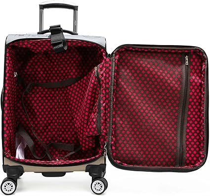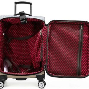 • Asas superiores y laterales elásticas. Compartimentos delanteros y principales con cremallera Correa con logotipo con hebilla de liberación lateral en la parte superior (te permite fijar bolsas adicionales al equipaje) 4 ruedas giratorias de 360° para garantizar la movilidad en cualquier dirección. Placa de identificación grabada con logotipo y tiradores de cremallera. Herrajes dorados